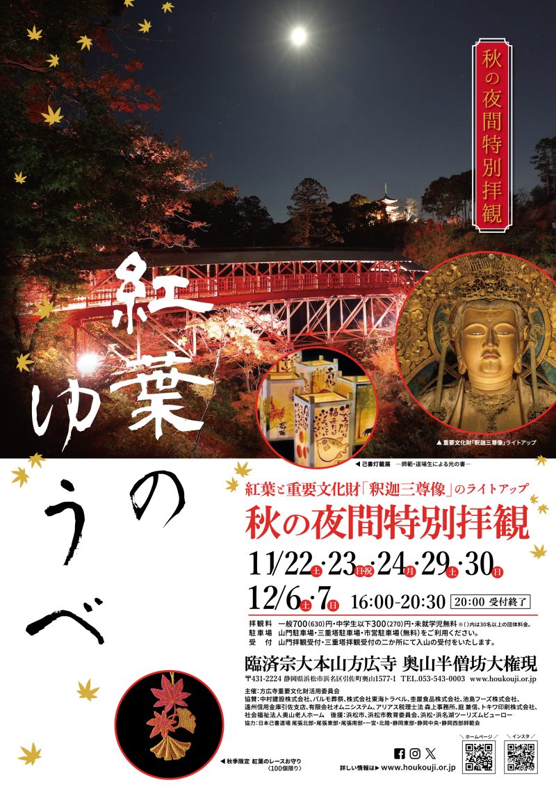 紅葉と重要文化財「釈迦三尊像」のライトアップ「秋の夜間特別拝観」を開催いたします。